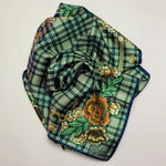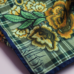 Uplift any wardrobe ensemble with our Irene & Me Pretty in Plaid scarf. It features a classic plaid pattern in subtle blue and green hues and deep earth tone accents, with elegant gold flowers adorning every corner. It is made from 100% pure silk twill, handmade by experienced Italian masters, and is machine hemmed, offering a durable, contrasting hem.