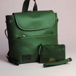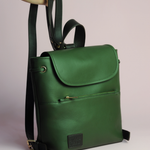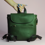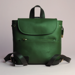 The hardware is gold, perfectly fitting with the forest-green leather. It features a top carry handle with dark brown leather backpack shoulder straps and a drawstring on the side. Our Rebel Redd leather backpack is also roomy enough to fit all your stuff and even fit a small tablet.