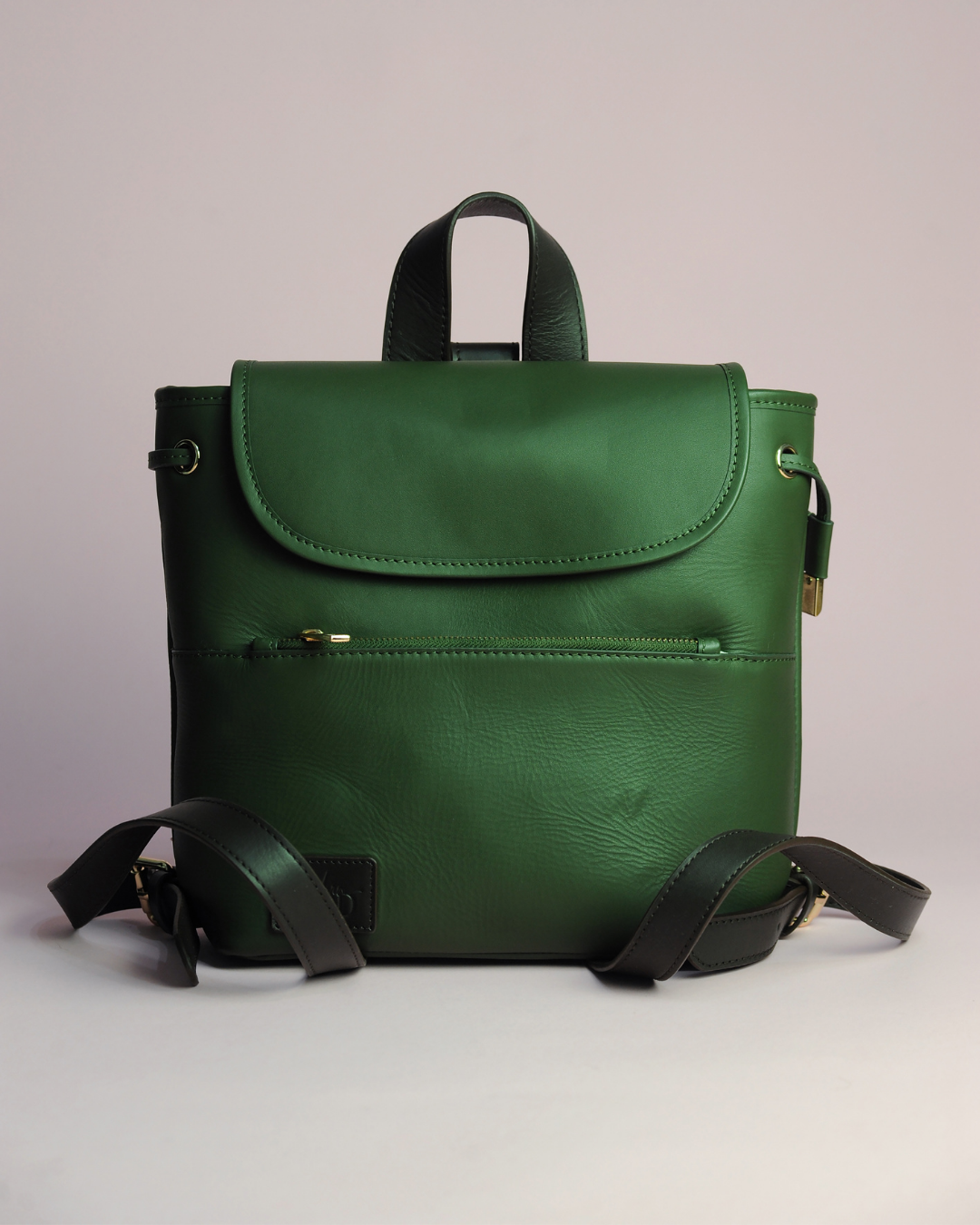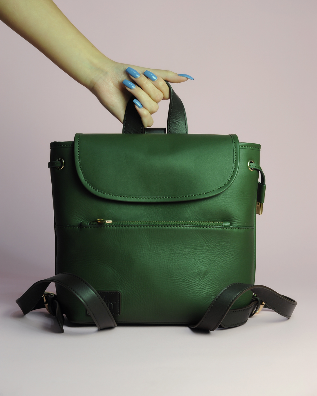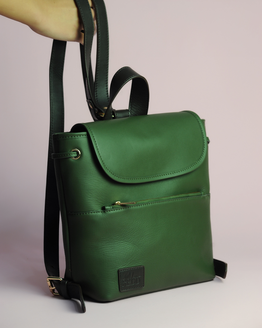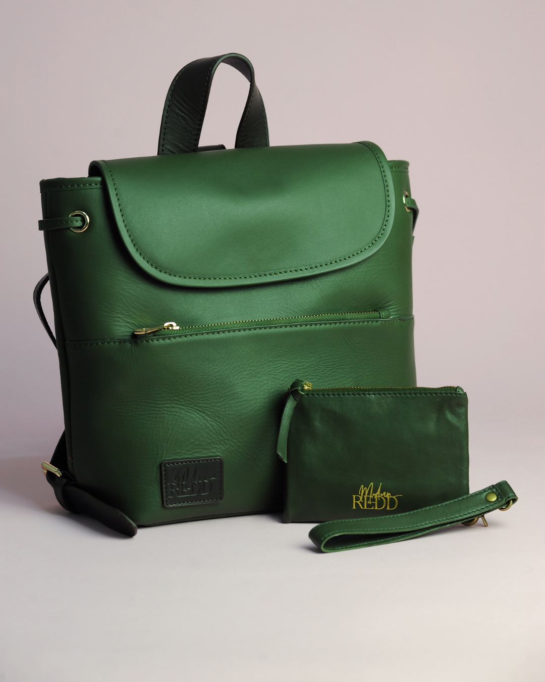 The hardware is gold, perfectly fitting with the forest-green leather. It features a top carry handle with dark brown leather backpack shoulder straps and a drawstring on the side. Our Rebel Redd leather backpack is also roomy enough to fit all your stuff and even fit a small tablet.
