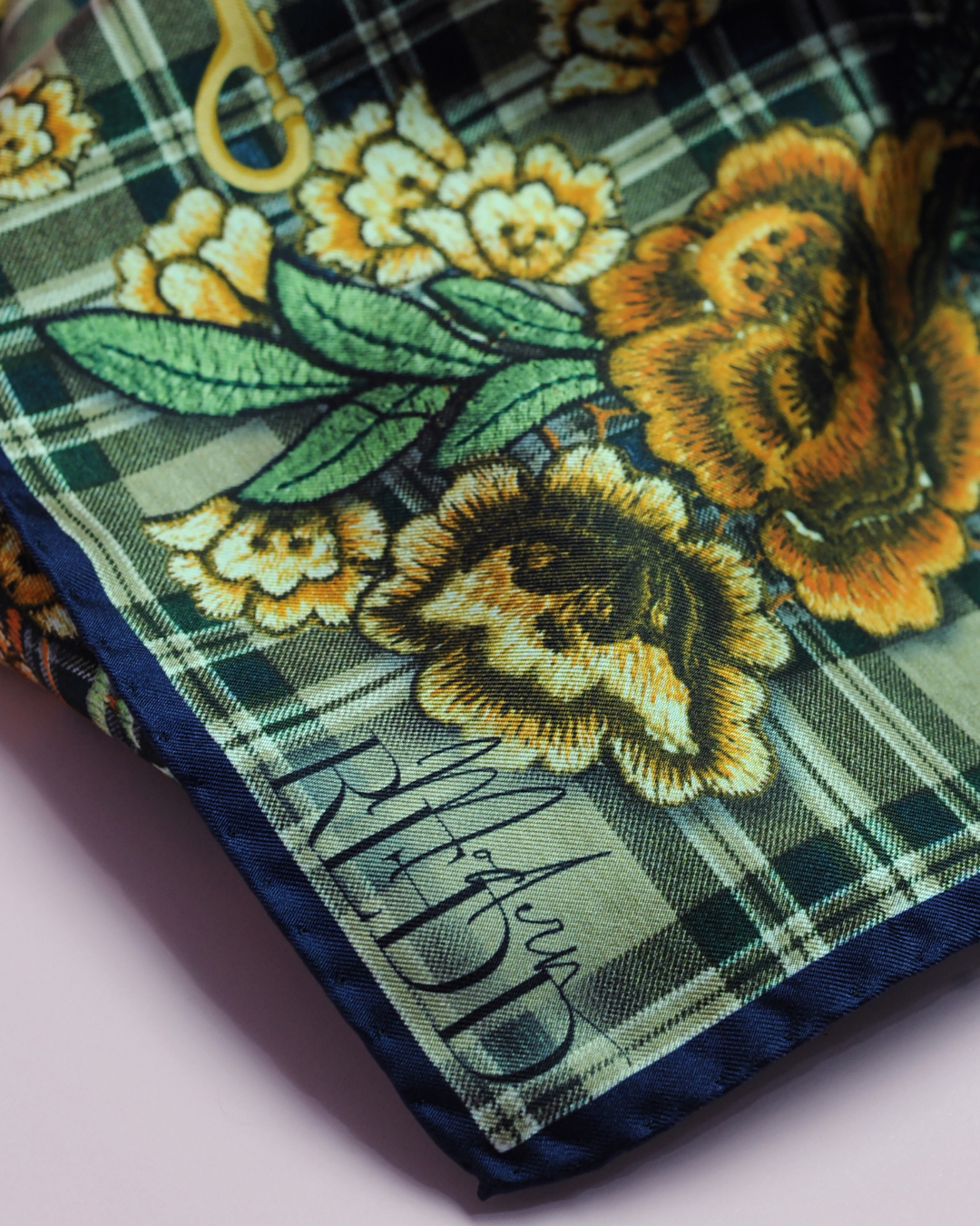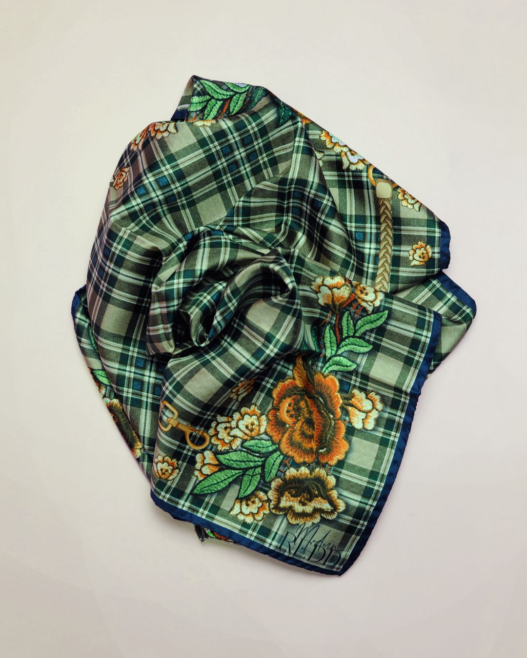 Uplift any wardrobe ensemble with our Irene & Me Pretty in Plaid scarf. It features a classic plaid pattern in subtle blue and green hues and deep earth tone accents, with elegant gold flowers adorning every corner. It is made from 100% pure silk twill, handmade by experienced Italian masters, and is machine hemmed, offering a durable, contrasting hem.