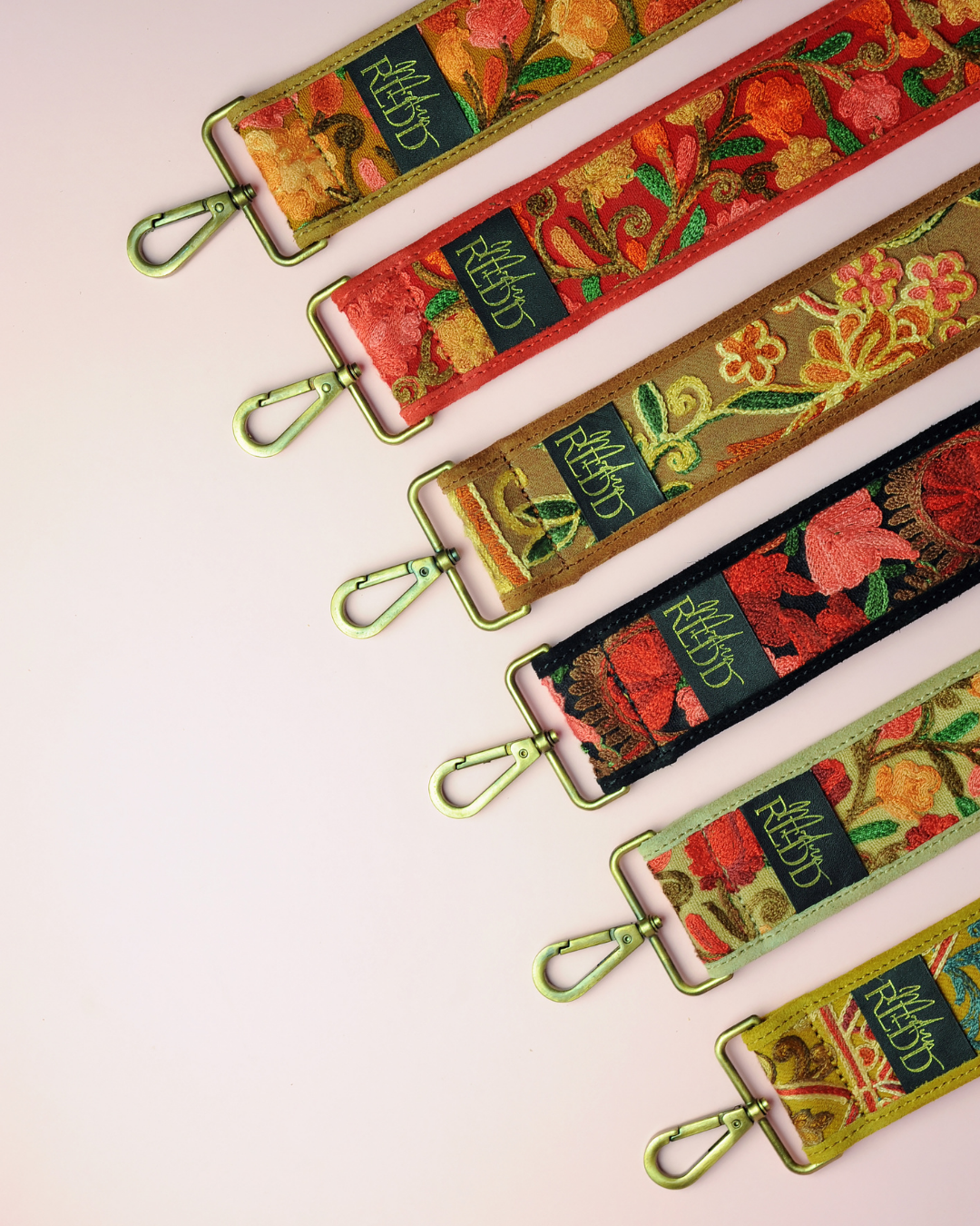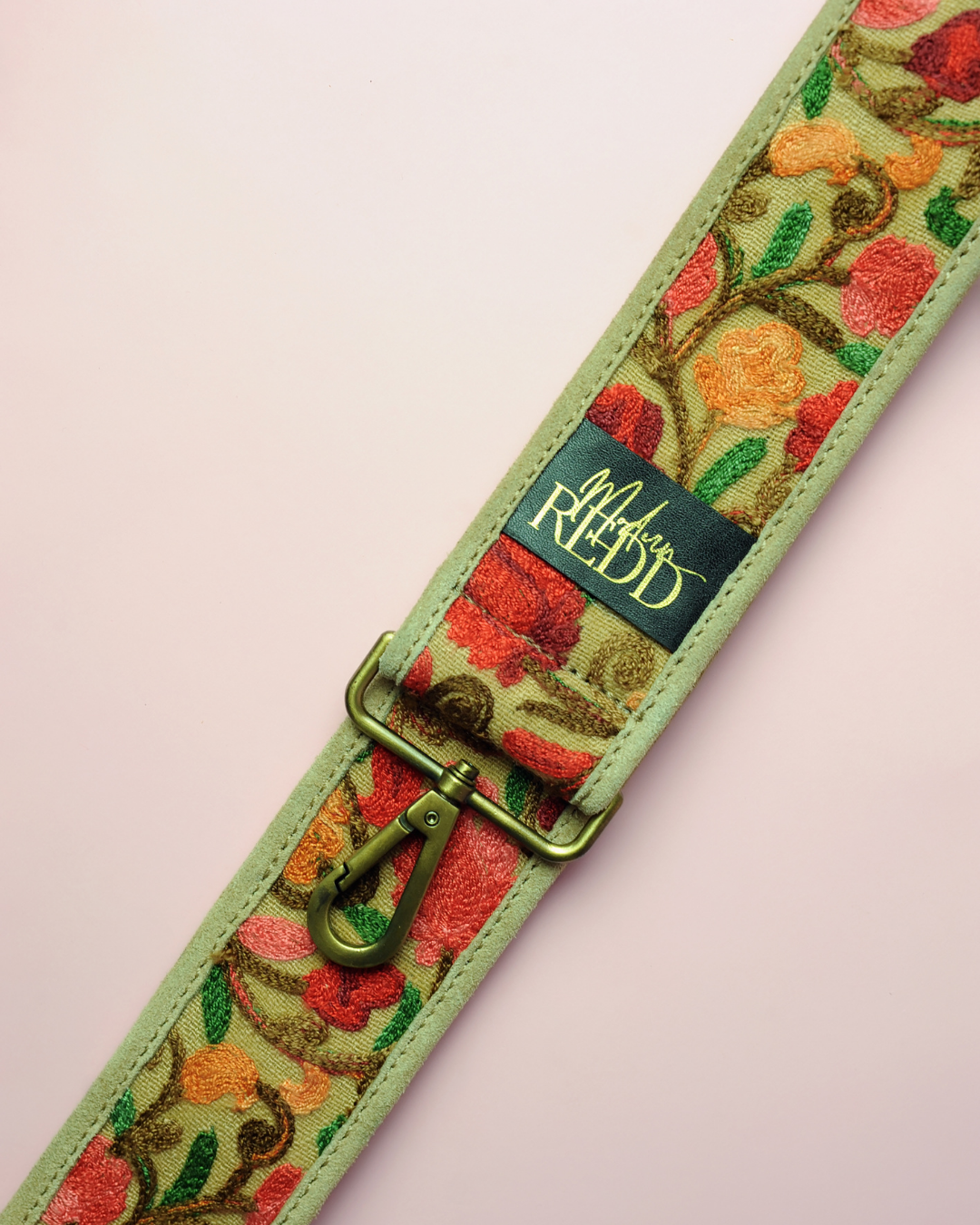 We give you our Modern Redd Artisan Redd Embroidered replacement strap. This is an excellent accessory you can use to elevate the look of your favorite bag, purse, or backpack. The Hazelwood Tan model is made from lovely tan silk with little embroidered flowers, backed by top-grain cow suede leather in hazel color.