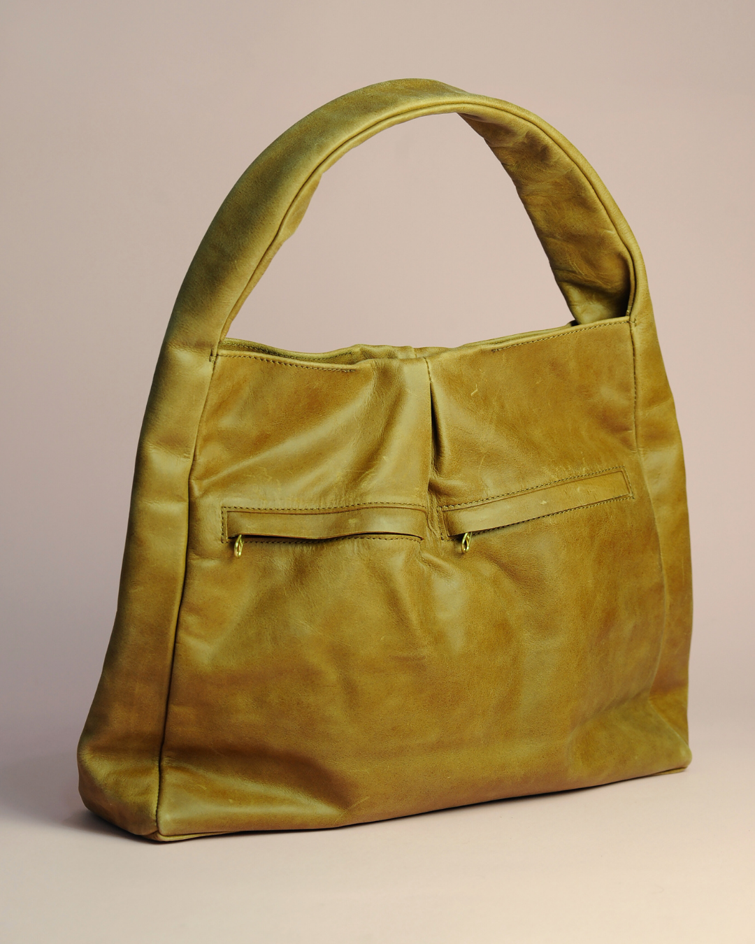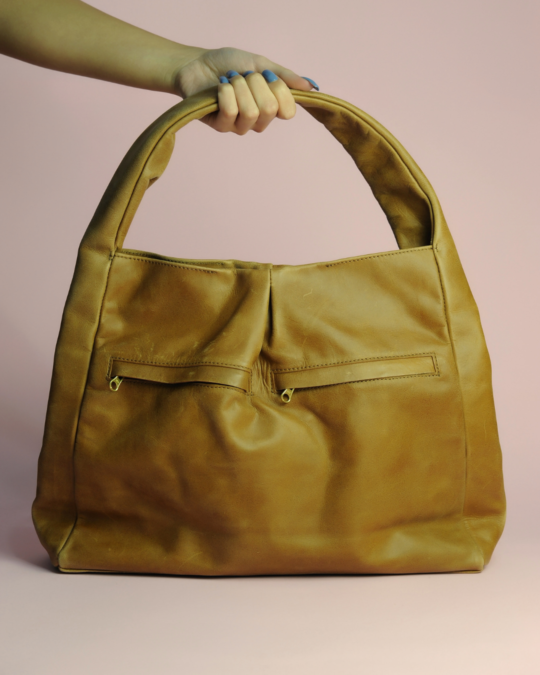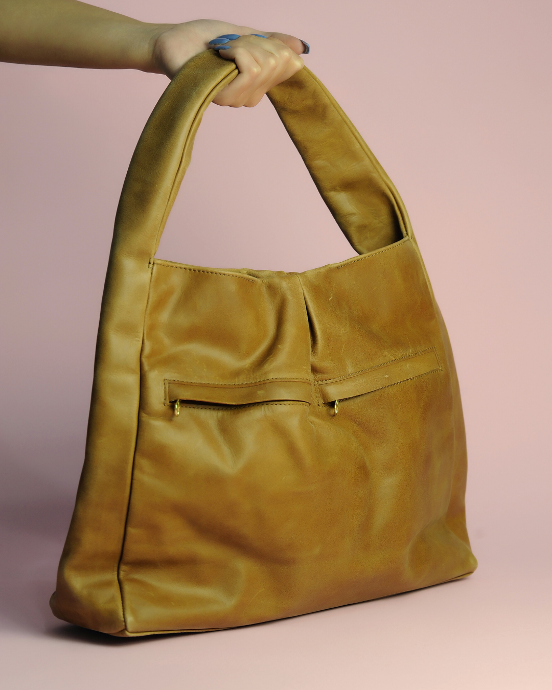 There is no exterior hardware, and only two antique brass zipper pulls that peek from the front pockets; this design uniquely amplifies the beauty of the smooth caramel-colored leather while ensuring you can easily pair it with almost all everyday wardrobe choices.