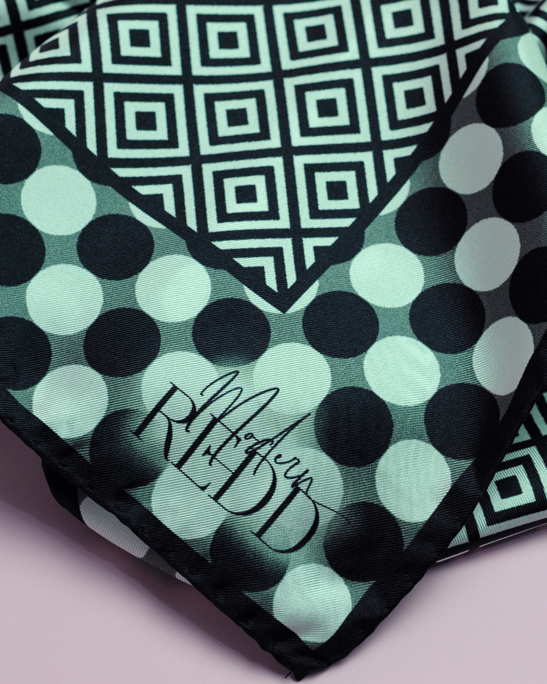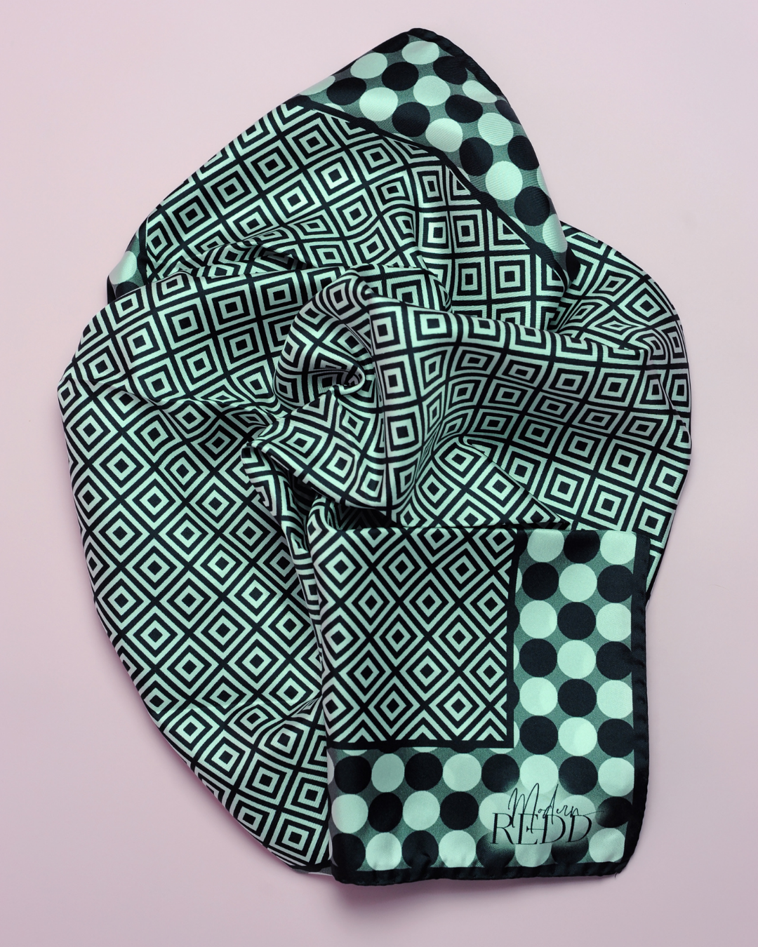 Combining squares and circles, the Modern Redd Mooi Monique Circles scarf is an essential accessory that you can wear with endless outfits. The geometric patterns are expertly blended in the square scarf: the interior square features dark and light squares and a border frame with dark and light circles frames it, creating an overall dimensional effect that feels airy and elegant.