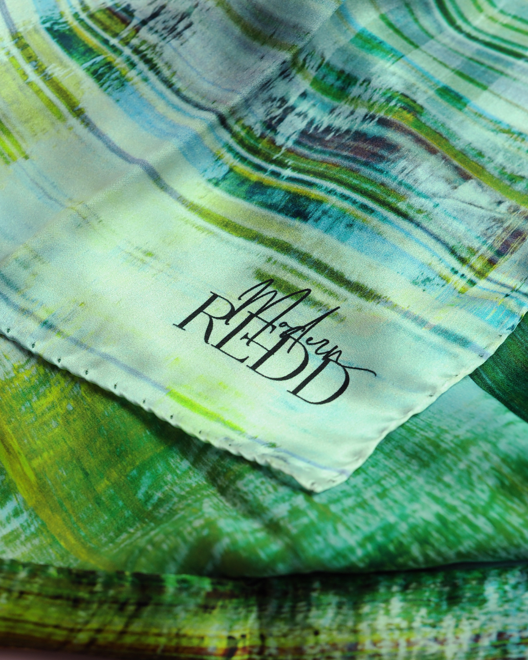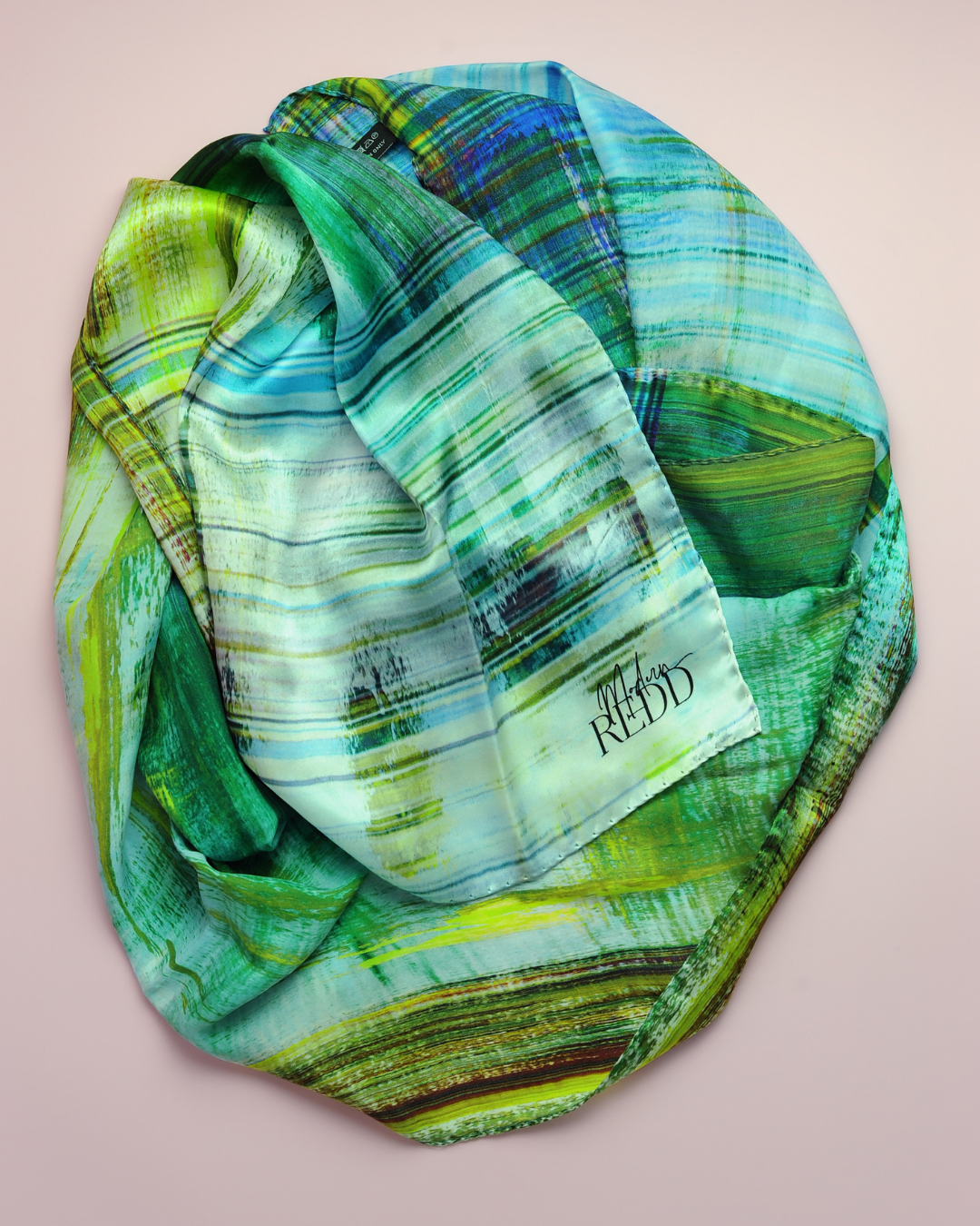 The Girlean Modish Redd Abstract scarf features an impressive design with a vintage-inspired pattern of abstract lines in beautifully complementing shades of light blue to dark green. The retro pattern features the Modern Redd logo, which is seamlessly included in the design, and the model is versatile and perfect to add to everyday and dressier outfits.
