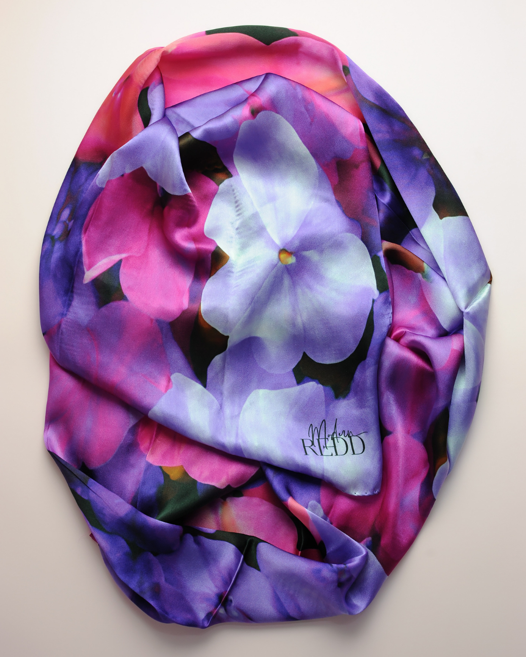 The Irene & Me Floral scarf is a lightweight, elegant scarf that is made from 100% silk, crafted by hand, and hemmed by machine. The design is universal, and you can even wear it as a lightweight wrap for a more elegant occasion.