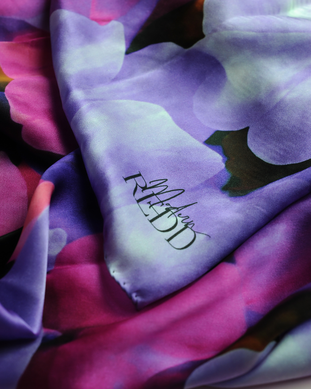 We present the Irene & Me floral scarf in shades of purple. The scarf features a design of elegant flowers in shades of varying purples, adding a romantic feel and look to the scarf. The scarf has a rectangular shape, which makes it versatile, allowing you to tie it in different ways.